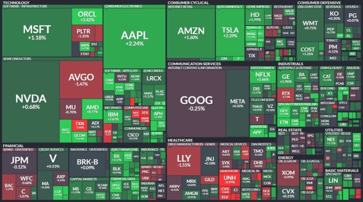 昨日のS&P500のヒートマップを眺めると、ほとんどの銘柄が上げていることが分かります。