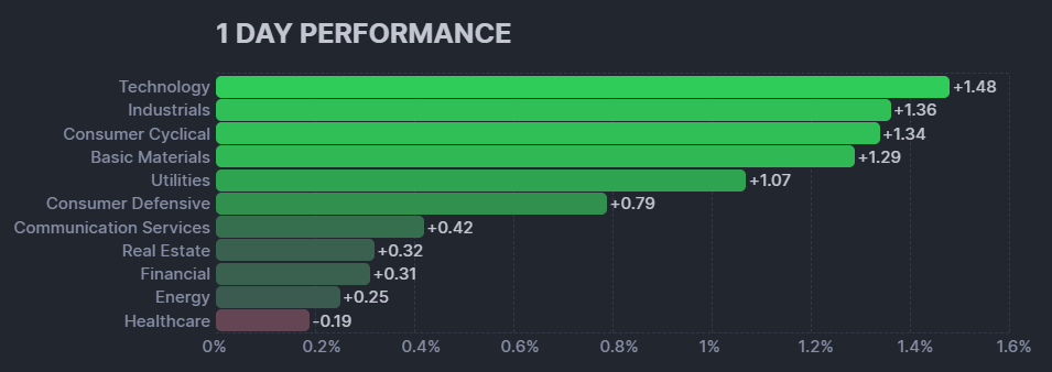 昨日のセクター別パフォーマンスは10セクターが上昇、1セクターが下落した1日となりました。