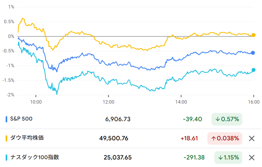 マグニフィセント7は2銘柄が上昇、5銘柄が下落。NVDAが▲5.46%、TSLAが▲2.21%、GOOGが▲1.76%と大きく下げています。