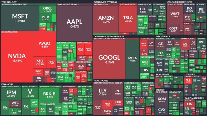 昨日のS&P500のヒートマップを眺めると、半導体を中心に下げていることが分かります。