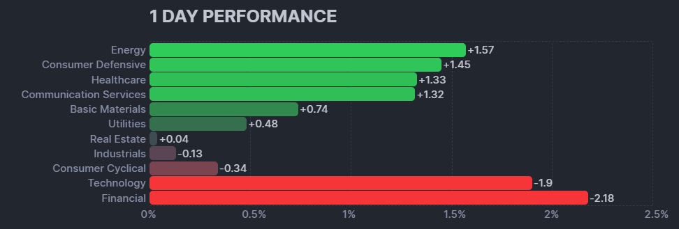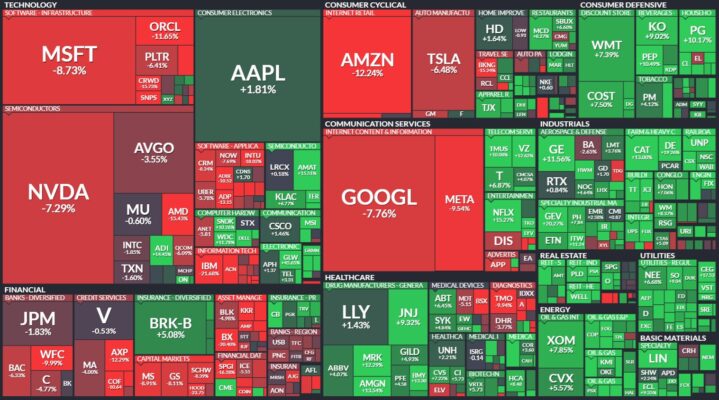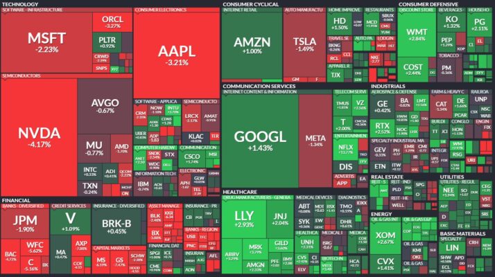 昨日のS&P500のヒートマップを眺めると、テックと金融が大きく下げていることが分かります。