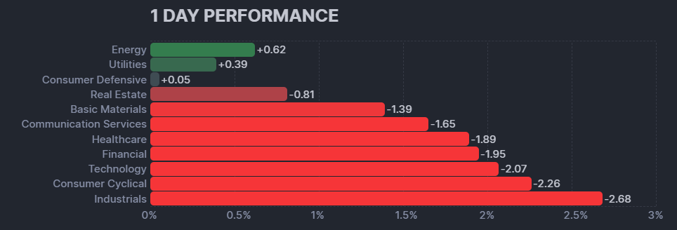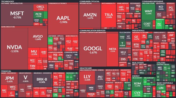 昨日のS&P500のヒートマップを眺めると、ほとんどの銘柄が下落していることがわかります。
