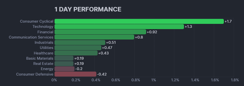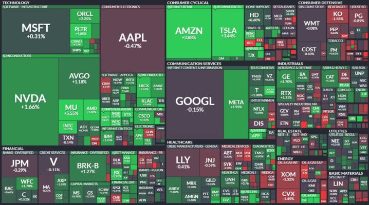 昨日のS&P500のヒートマップを眺めると、多くの銘柄が上昇していることが分かります。
