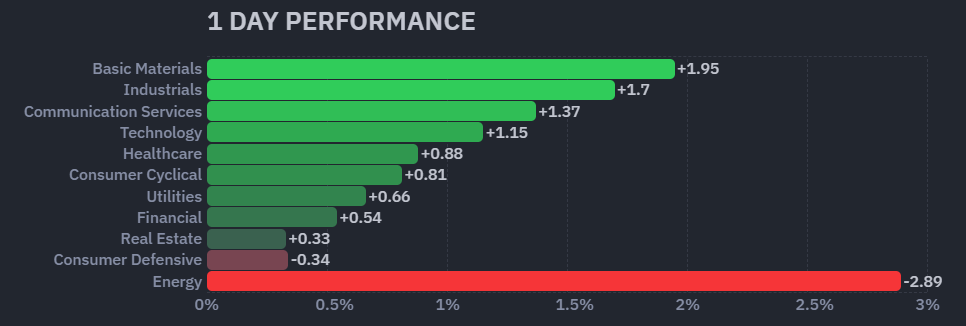 昨日のセクター別パフォーマンスは9セクターが上昇、2セクターが下落した1日となりました。