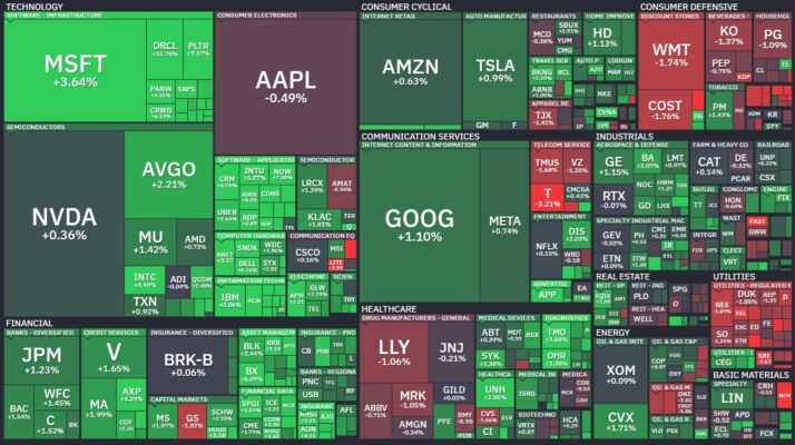 昨日のS&P500のヒートマップを眺めると、多くの銘柄が上昇したことがわかります。