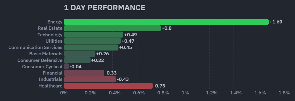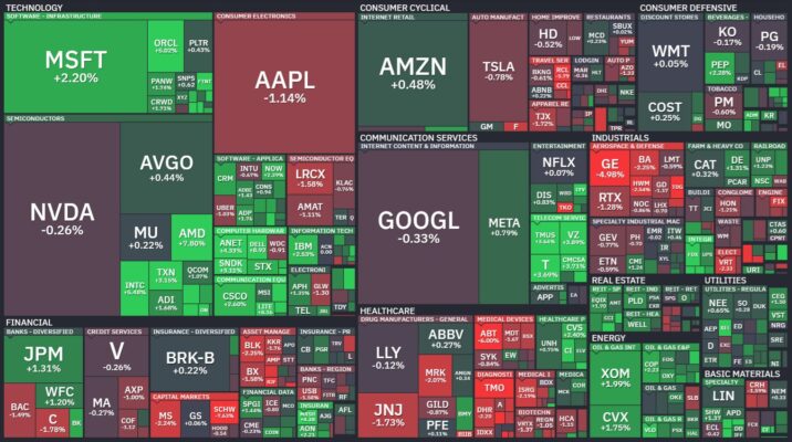 昨日のS&P500のヒートマップを眺めると、上昇と下落の銘柄が半々といったように見えます。