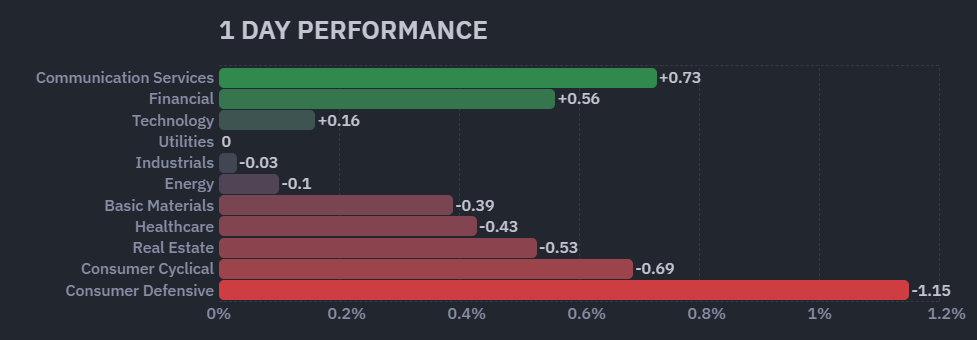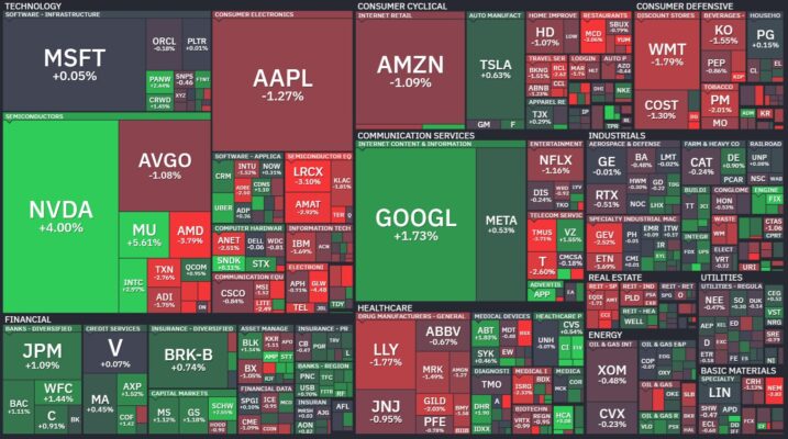 昨日のS&P500のヒートマップを眺めると、上昇と下落の銘柄が半々といったように見えます。