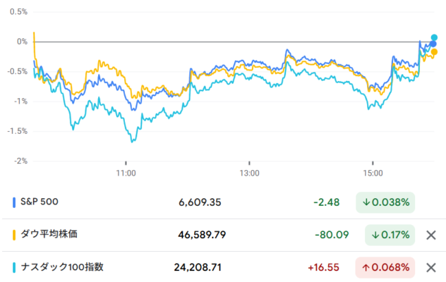 マグニフィセント7は4銘柄が上昇、3銘柄が下落。GOOG+2.11%と買われていますが、AAPL▲2.07%、TSLA▲1.75%大きく下げています。