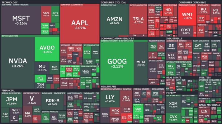 昨日のS&P500のヒートマップを眺めると、上昇と下落が半々といったように見えます。