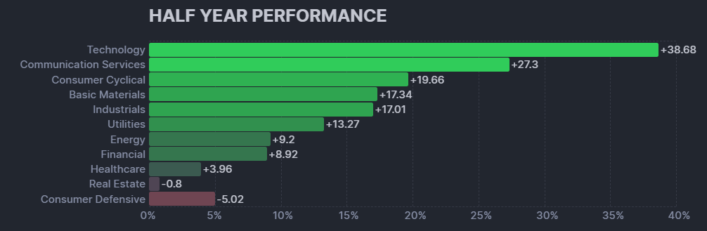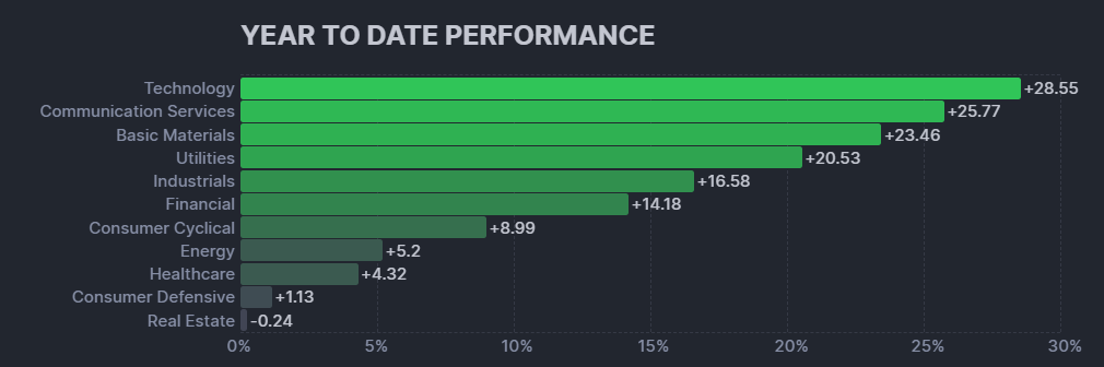 一方で、8セクターが指数をアンダーパフォームしており、ヘルスケアと不動産、生活必需品はマイナスリターン。