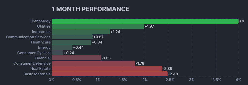 直近1ヶ月は11セクターのうち7セクターがプラス、4セクターがマイナスとなった相場でした。