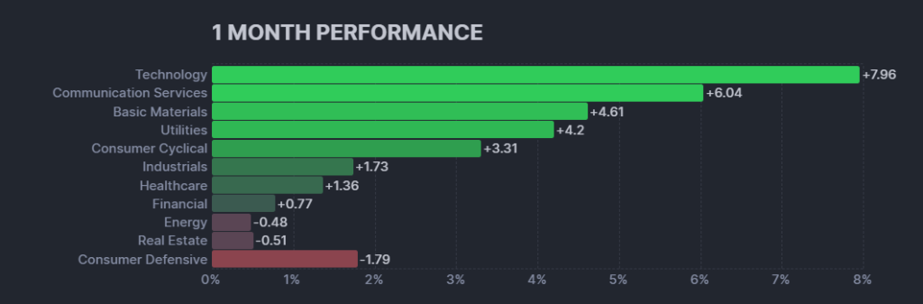 直近1ヶ月は11セクターのうち8セクターがプラス、3セクターがマイナスとなった相場でした。