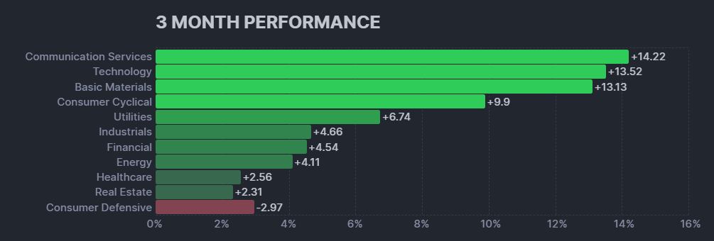 直近3ヶ月では11セクターのうち10セクターがプラス、1セクターがマイナスとなった相場でした。