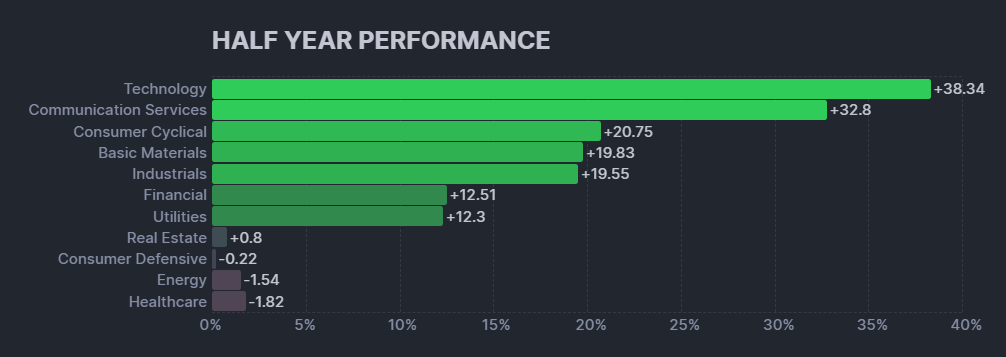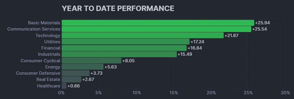ヘルスケア、不動産、生活必需品は優れませんが、全セクターがプラスとなりました。