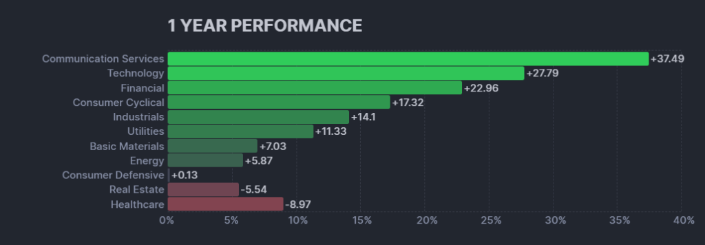 直近1年のリターンはS&P500を上回ったのは4セクターで、通信、金融、一般消費財、情報技術でした。