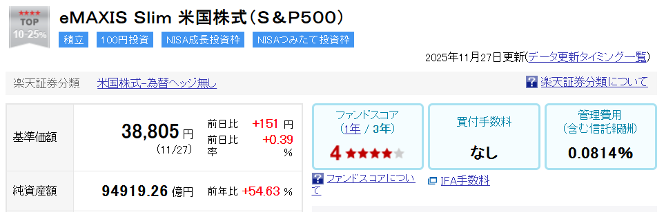 私自身は、楽天証券でeMAXIS Slim全米株式(S&P500)をつみたてNISAで買い付けをしていました。同ファンドは、現在つみたてNISAを含む投資信託の中でも人気の銘柄です。