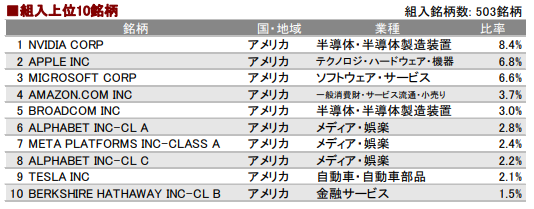 ハイテク株を中心としたエヌビディアやマイクロソフト、アップルやアマゾンなどが上位に名を連ねています。
