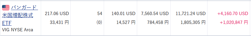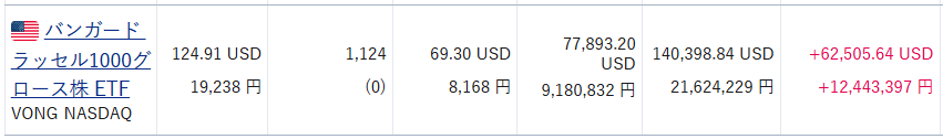 VONGはもともと特定口座でも保有していた分もあるので、平均取得単価やリターンが合算されてしまいました。(当時の取得単価$60.42に割り戻して運用実績を計算しています。)