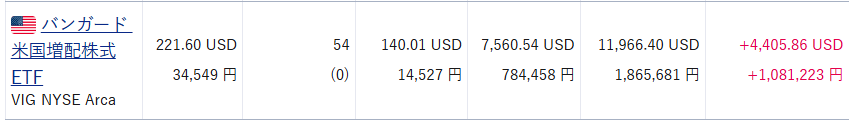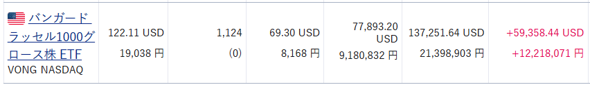 VONGはもともと特定口座でも保有していた分もあるので、平均取得単価やリターンが合算されてしまいました。(当時の取得単価$60.42に割り戻して運用実績を計算しています。)