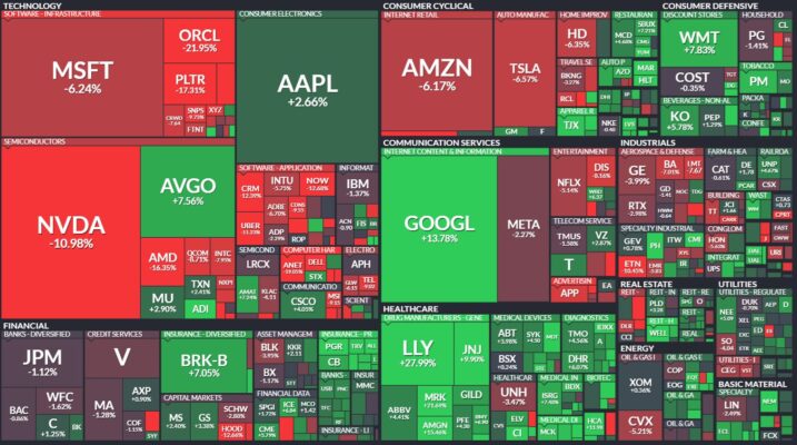 テックの中にはORCLが▲21.95%、PLTRが▲17.31%、AMDが▲16.35%、SMCIが▲36.82%と急落していますが、ヘルスケアにはLLY+27.99%、MRK+21.69%、REGN+20.38%など大きく上昇した銘柄もありました。