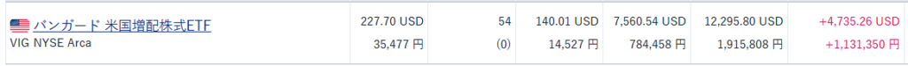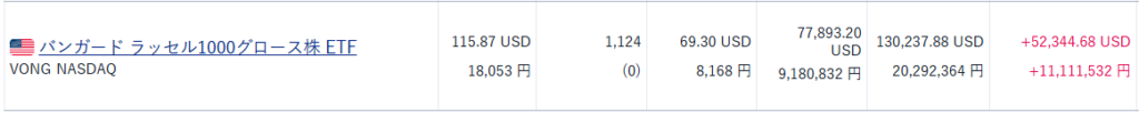 VONGはもともと特定口座でも保有していた分もあるので、平均取得単価やリターンが合算されてしまいました。(当時の取得単価$60.42に割り戻して運用実績を計算しています。)