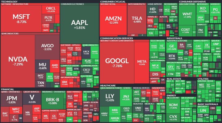 マグニフィセント7はAAPLだけが+1.81%とプラス。残り6銘柄はマイナスでAMZN▲12.24%、META▲9.54%、MSFT▲8.73%、GOOG▲7.76%、NVDA▲7.29%、TSLA▲6.48%と大きく下げています。